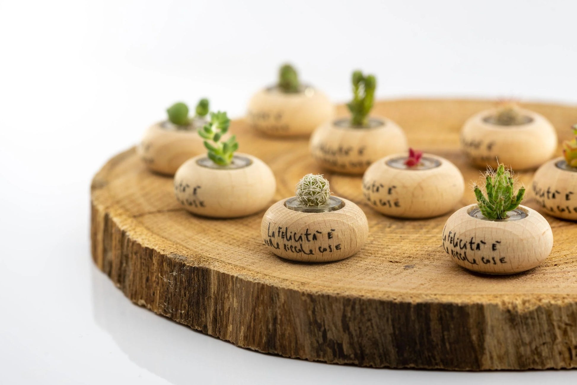Piccolo vaso in legno di faggio con incisione per le nostre piccole ed amate piante grasse bonsai. Interamente progettato e realizzato artigianalmente in Italia, a Bergamo.