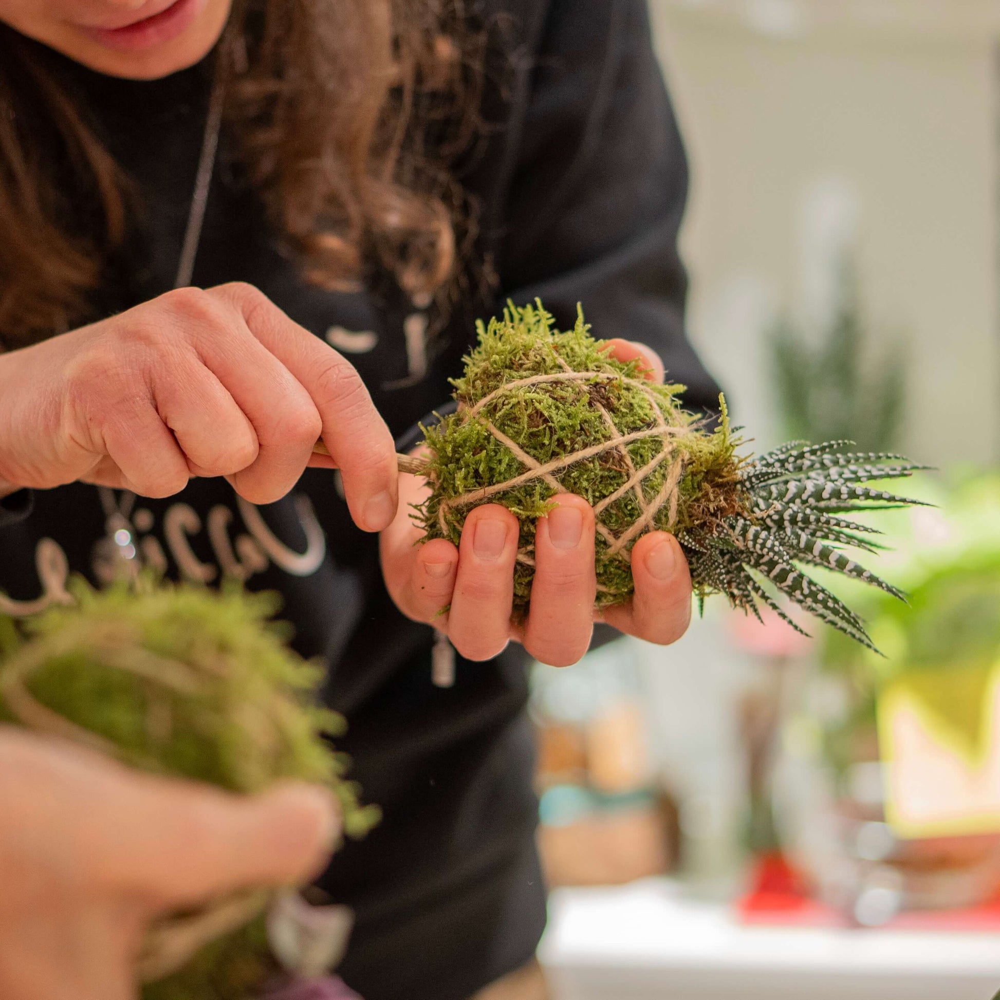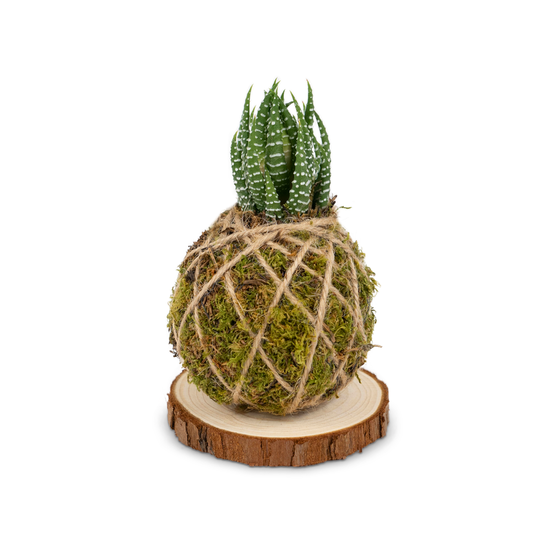 Il Kokedama è una pianta che spunta dalla sommità di una sfera ricoperta di muschio. È possibile realizzarlo con tutte le piante, anche se è preferibile utilizzare quelle con dimensioni contenute. Le radici vengono avvolte in uno speciale substrato lavorato a mano sino ad assumere la forma di una sfera (possono anche essere realizzate altre forme geometriche) e successivamente ricoperto da muschio naturale vivo. Il tutto viene legato con spago e filo di cotone.