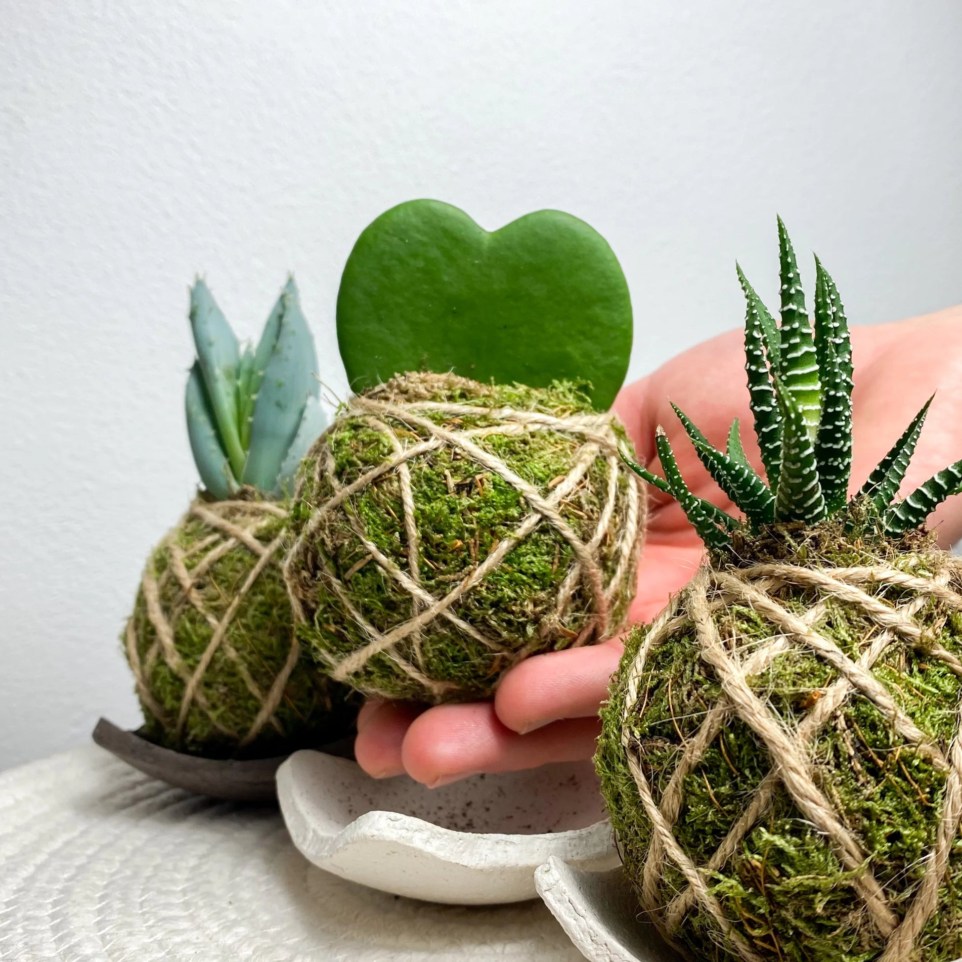 Il Kokedama è una pianta che spunta dalla sommità di una sfera ricoperta di muschio. È possibile realizzarlo con tutte le piante, anche se è preferibile utilizzare quelle con dimensioni contenute. Le radici vengono avvolte in uno speciale substrato lavorato a mano sino ad assumere la forma di una sfera (possono anche essere realizzate altre forme geometriche) e successivamente ricoperto da muschio naturale vivo. Il tutto viene legato con spago e filo di cotone.