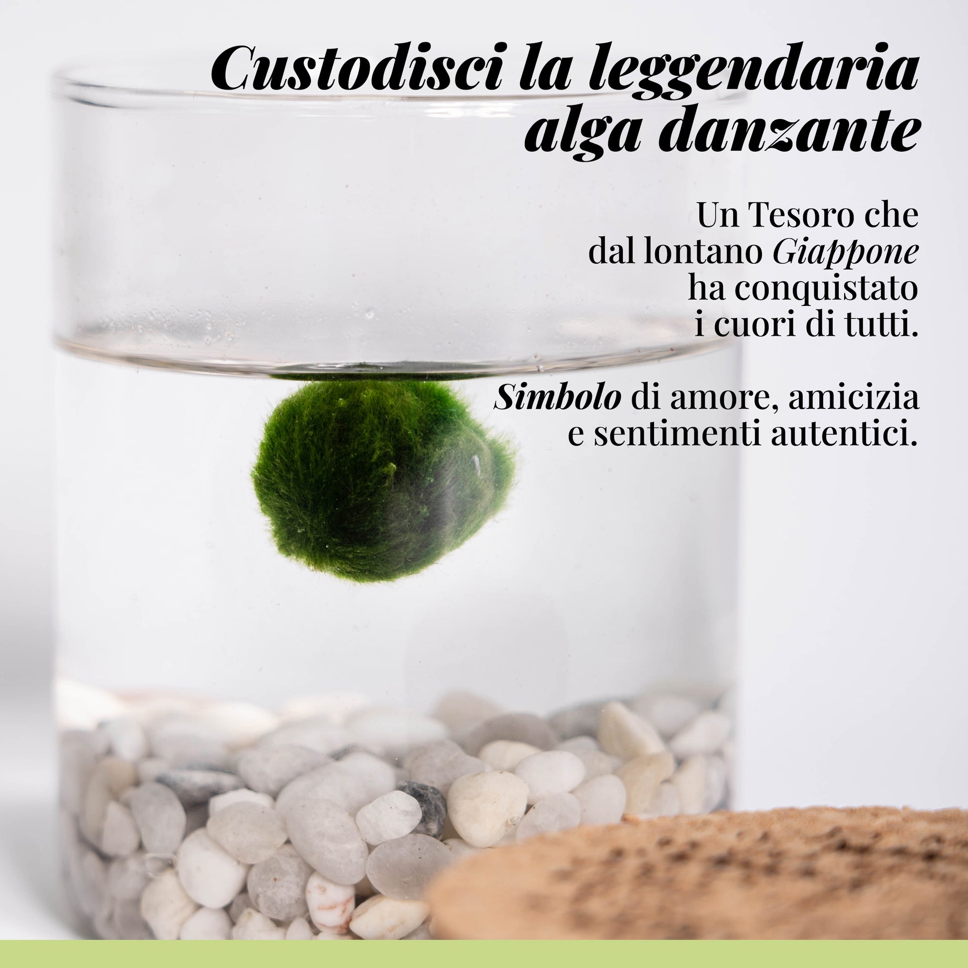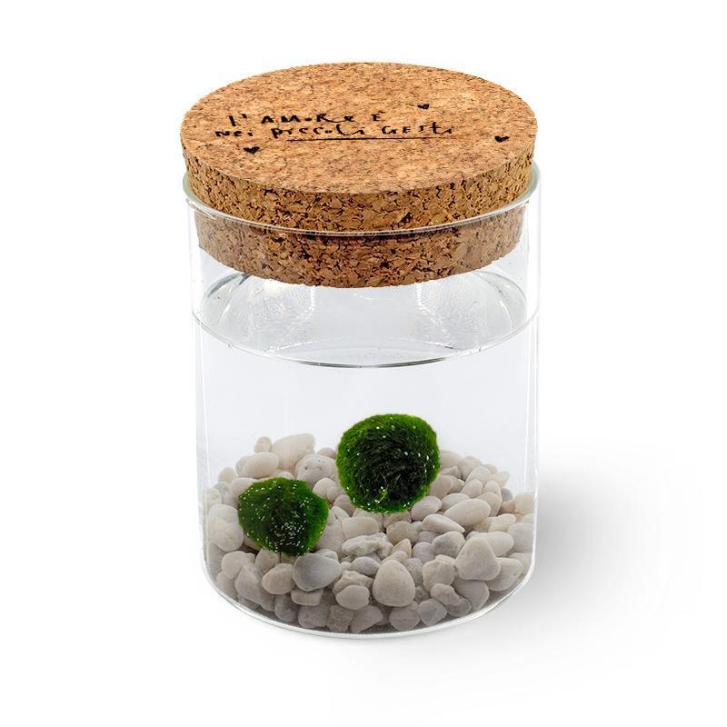 Marimo Original®. Un’alga dalla storia leggendaria custodita in un esclusivo vaso di vetro con tappo in sughero marchiato a laser, con frase “L'amore è nei piccoli gesti”.