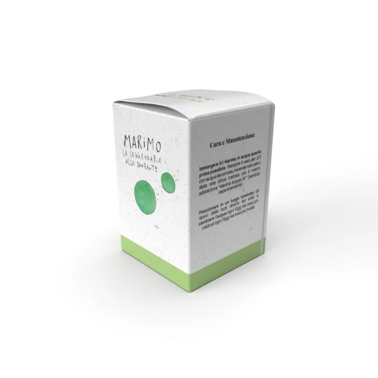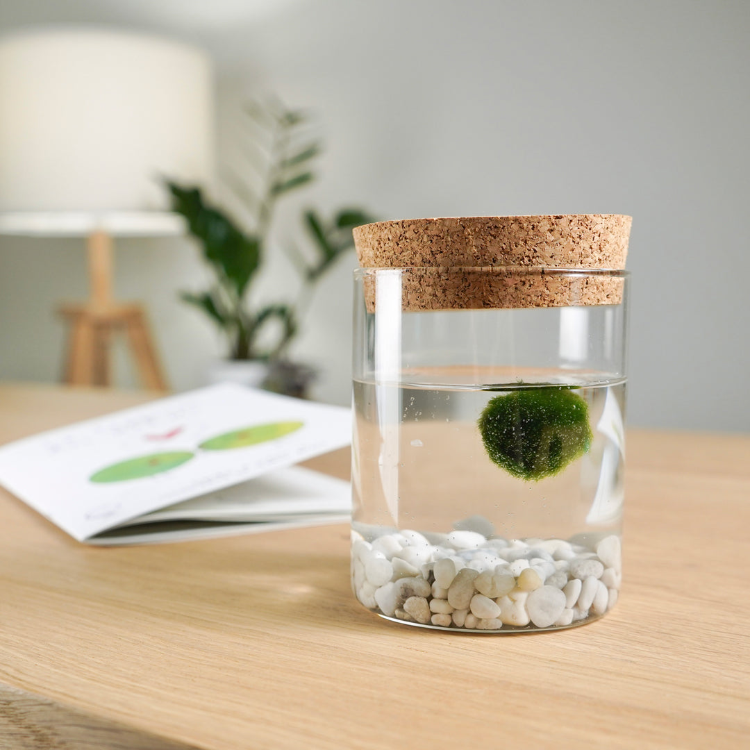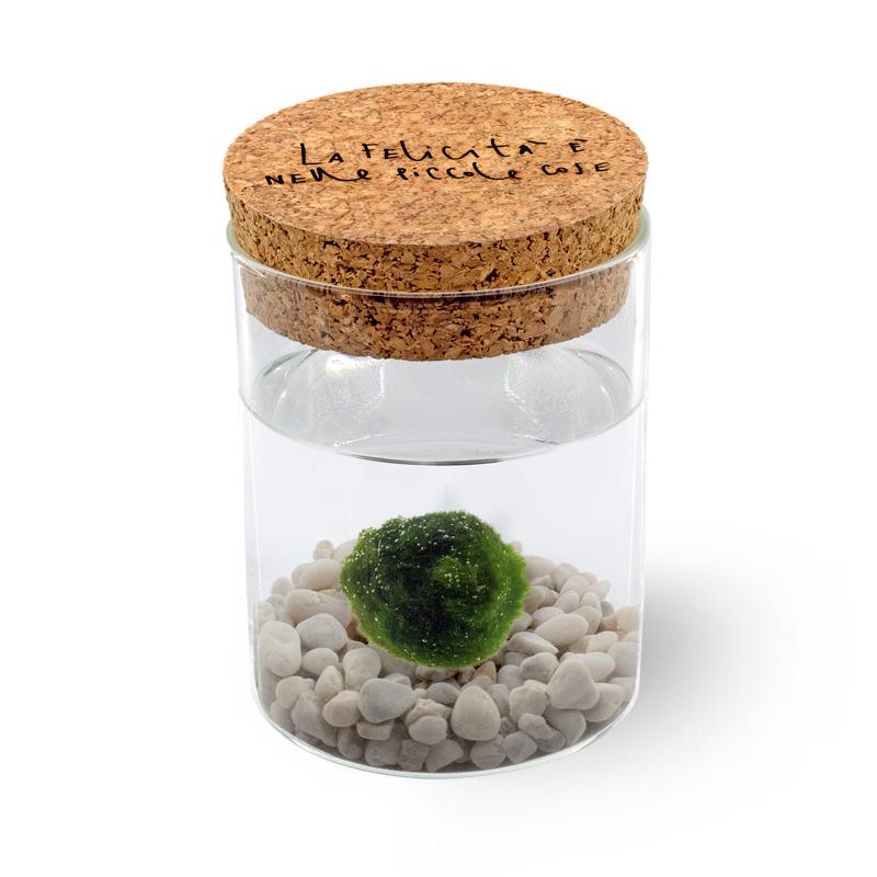 Marimo Original®. Un’alga dalla storia leggendaria custodita in un esclusivo vaso di vetro con tappo in sughero marchiato a laser, con frase “La Felicità è nelle Piccole Cose”.
