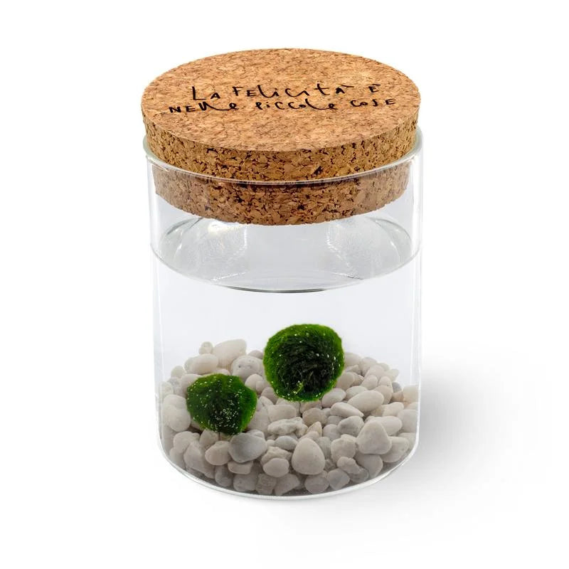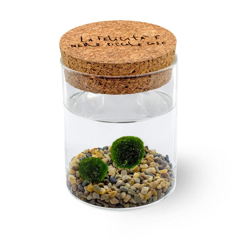 Marimo Original®. Un’alga dalla storia leggendaria custodita in un esclusivo vaso di vetro con tappo in sughero marchiato a laser, con frase “La Felicità è nelle Piccole Cose”.